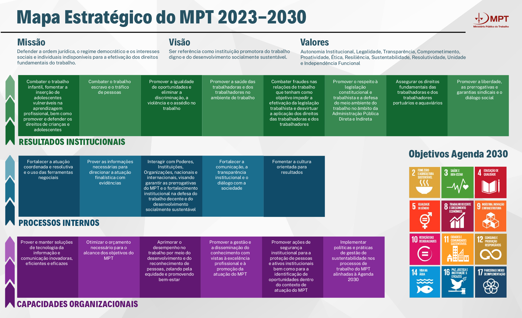 Conheça o Mapa Estratégico do Planejamento do MPT, os Objetivos Estratégicos, a Missão e os Valores. Conheça ainda o Caderno de Apresentação do PEI e os normativos afeitos ao Planejamento.